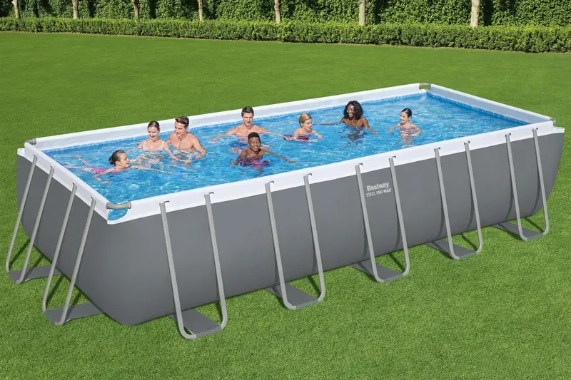 בריכה לגינה / לחצר מלבנית תוצרת חברת BESTWAY עשויה ממסגרת מתכת מגולוונת, דוחה אבק וחלודה ויריעת פוליאסטר ו- PVC.